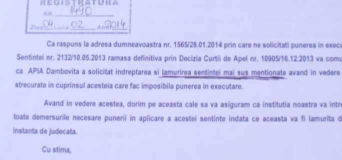 Trebuie să vă mai spunem că aberaţia cu „lămurirea sentinţei”, scrisă negru pe alb într-o adresă oficială către primăria cu care APIA a fost în litigiu, are girul Compartimentului Juridic. Fără comentarii!
