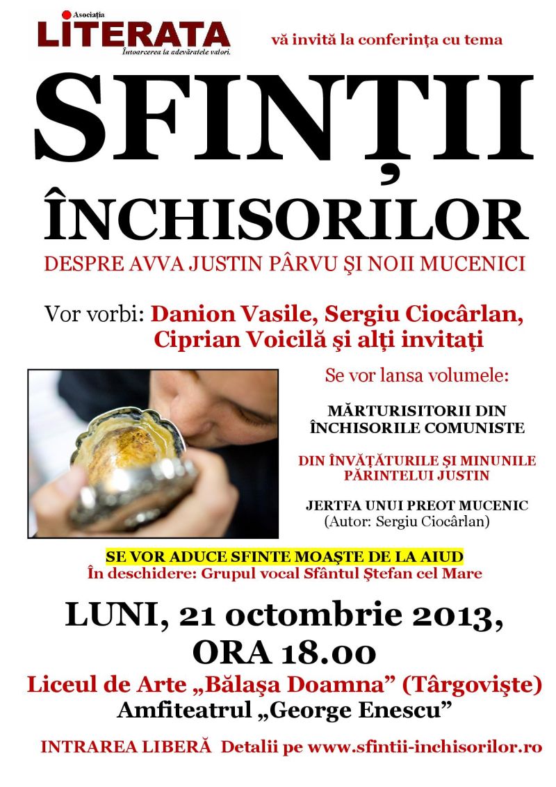 Asociatia LITERATA din Targoviste organizează luni, 21 octombrie, la Casa Tineretului din Târgovişte, incepand cu ora 18.00, conferința cu tema „Sfinții Închisorilor”.