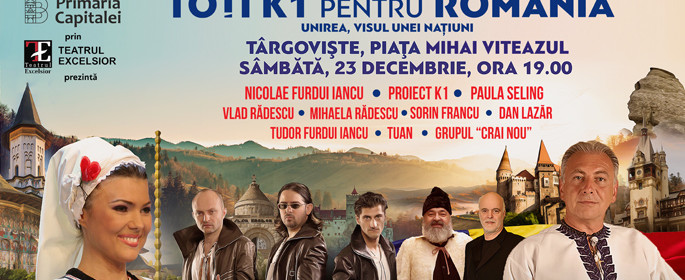 Sâmbătă, 23 decembrie 2017, de la ora 19:00, Primăria Târgovişte vă invită în Piaţa mihai Viteazul (Casa de Cultură a Sindicatelor) la concertul extraordinar "Toţi k1 pentru România - Unirea, visul unei Naţiuni", proiect care marchează centenarul Marii Unirii de la 1918.Articol Complet