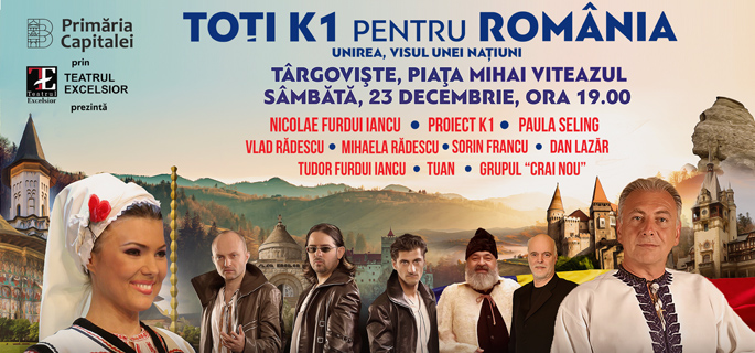 Sâmbătă, 23 decembrie 2017, de la ora 19:00, Primăria Târgovişte vă invită în Piaţa mihai Viteazul (Casa de Cultură a Sindicatelor) la concertul extraordinar „Toţi k1 pentru România – Unirea, visul unei Naţiuni”, proiect care marchează centenarul Marii Unirii de la 1918.
